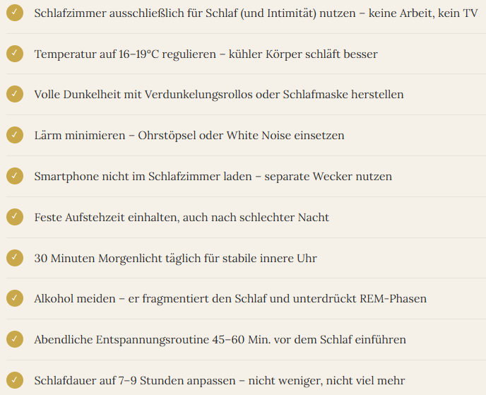 Guter Schlaf ist keine Schwäche oder Luxus – er ist biologische Notwendigkeit und das mächtigste Werkzeug für deine Gesundheit, Leistungsfähigkeit und dein Wohlbefinden, das du kostenlos besitzt. Die Wissenschaft ist eindeutig: Kein Supplement, kein Biohack, kein Training ersetzt eine erholsame Nacht.