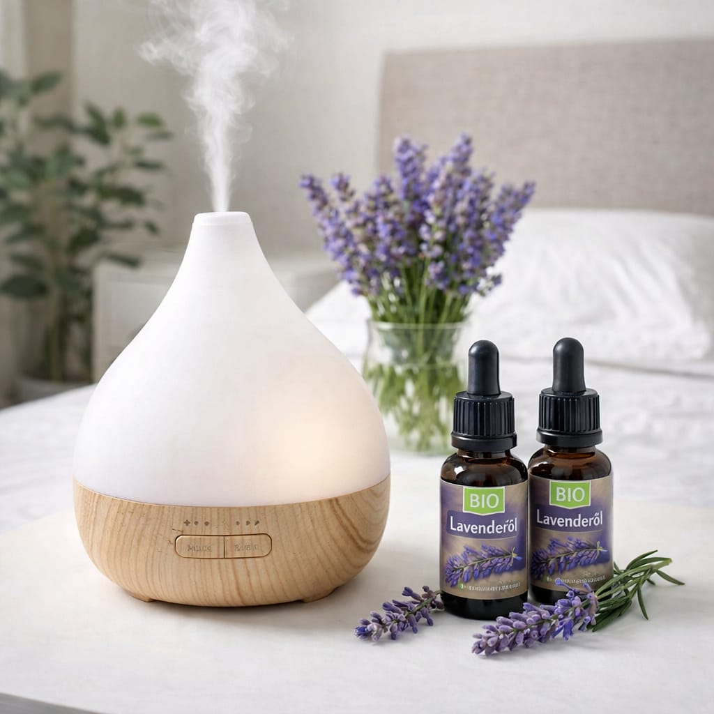 Lavendel, Baldrianwurzel und Kamille wirken nachweislich beruhigend auf das Nervensystem. Diffuser im Schlafzimmer nutzen.